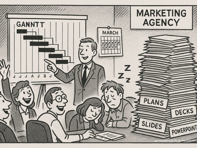 Zbyt wiele razy, gdy zatrudniałem agencję albo byłem zatrudniany przez klienta, pierwsze co się dzieje to „zróbmy plan”. Wjeżdżają wykresy Gantta, wieloetapowe roadmapy i ładnie pokolorowane slajdy. Gdy tak się dzieje, najczęściej zapowiada to długą i kosztowną współpracę z ograniczonym efektem.