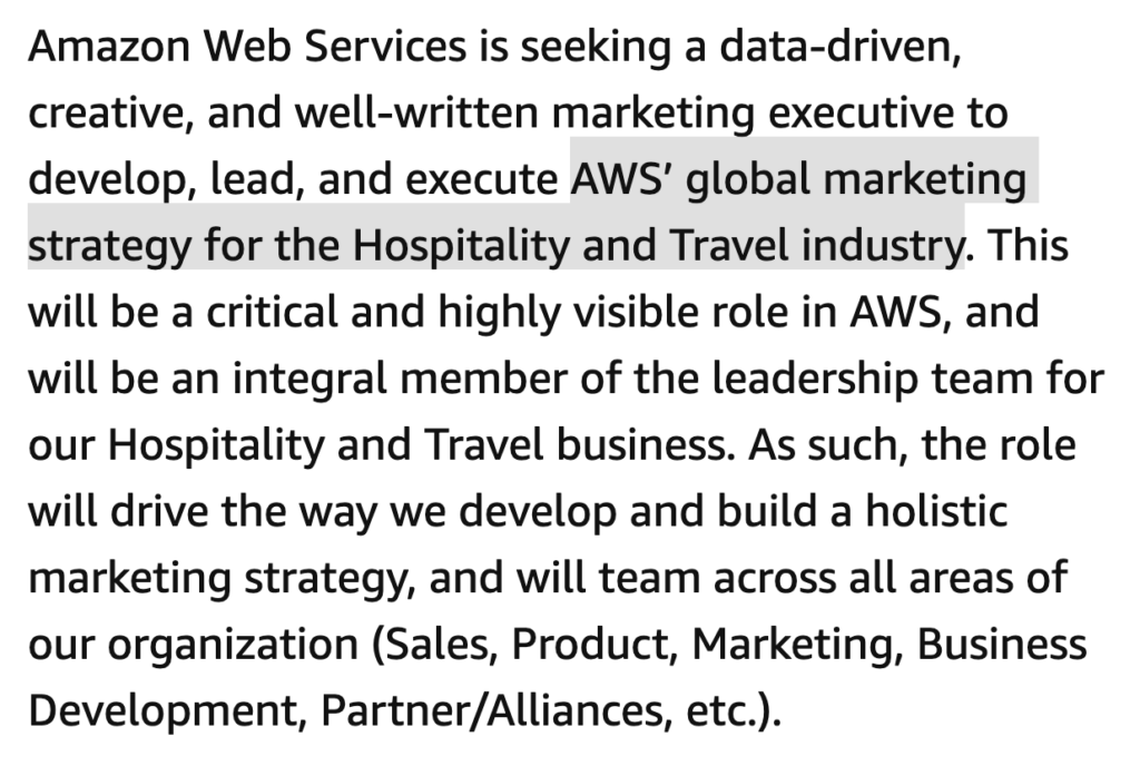 Amazon opublikował (ale już usunął) rekrutację na stanowisko Head of Marketing – Hospitality & Travel. Osoba miałaby zostać zatrudniona w celu opracowania, prowadzenia i realizacji globalnej strategii marketingowej AWS dla branży hotelarskiej i turystycznej. W tym miejscu można znaleźć zarchiwizowaną wersję ogłoszenia.